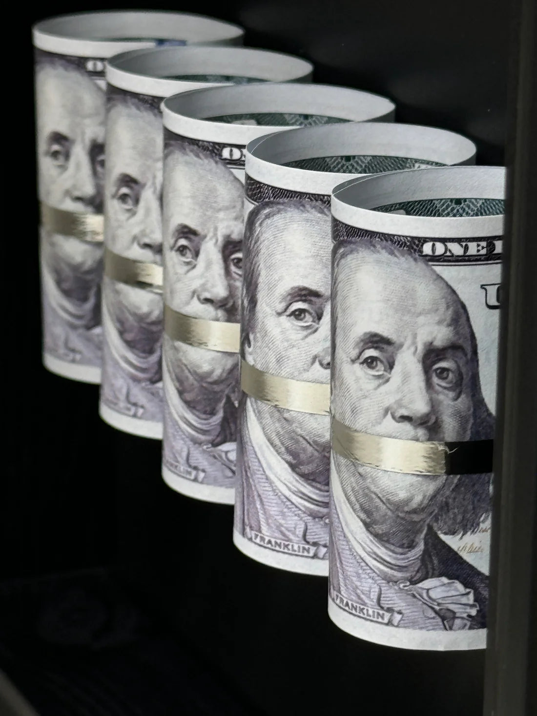 Symmetrical Precision: Features five $100 bills meticulously rolled and arranged in flawless lengthwise symmetry, creating a balanced and harmonious aesthetic.