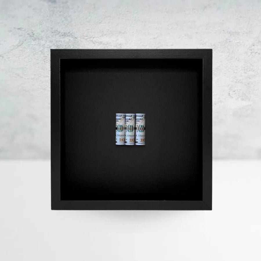 Minimalist Money Art, Modern Wall Decor, $100 Bill Art, Craft Vega, Sophisticated Home Decor. Upgrade your space with the Craft Vega "Triple Roll" Minimalist Art. Featuring three $100 bills in a clean, quiet, and gently rolled design, this piece offers a sophisticated touch of luxury. Protected by premium plexiglass for a durable, high-end finish. Perfect for the modern minimalist home.